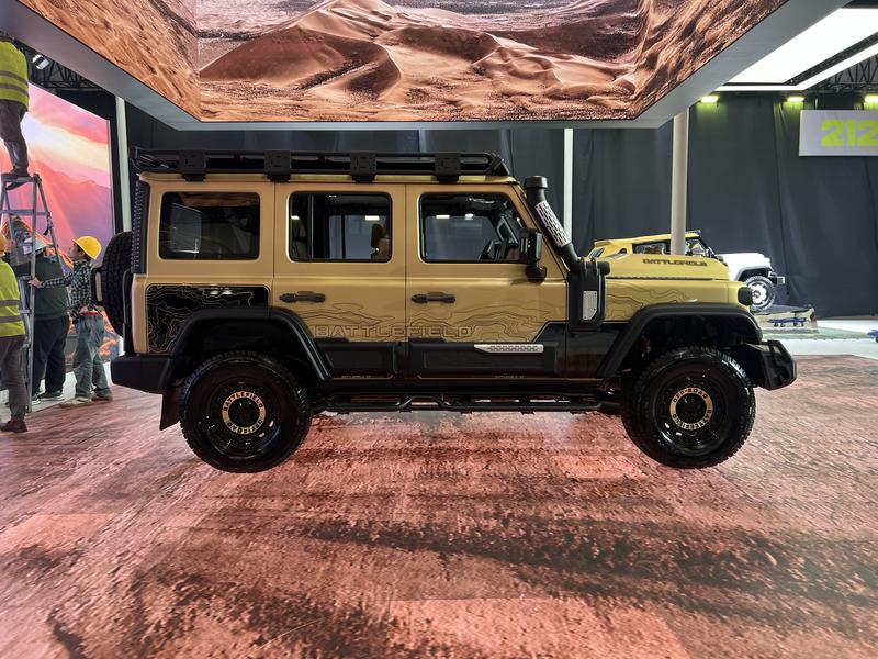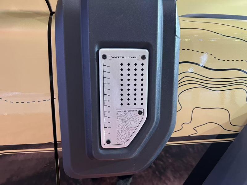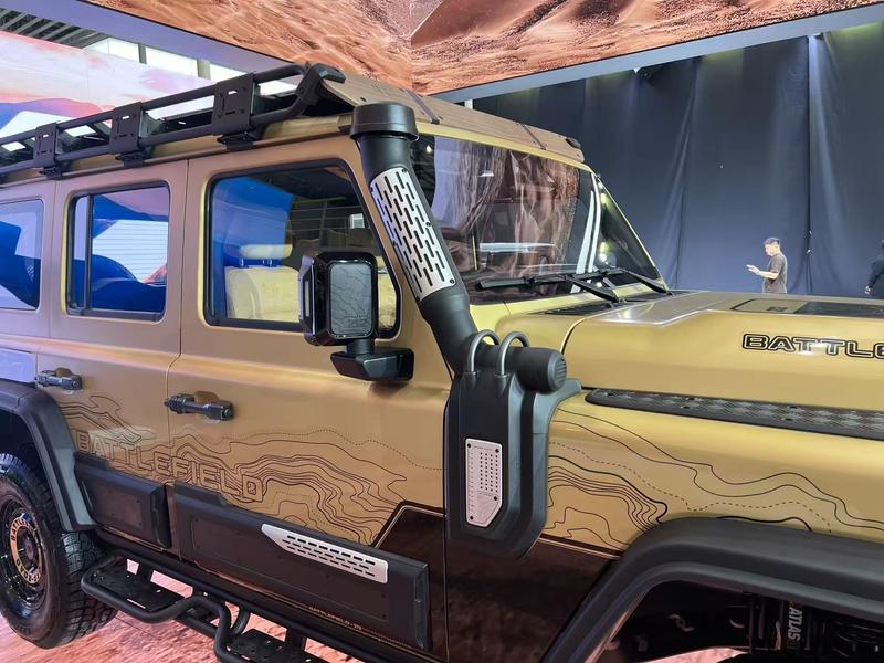车身侧面,新车配备了涉水喉、越野胎,整体造型十分硬派同时,新车拥有较高的离地间隙,通过性上非常强大。此外,新车还增加了顶架,并在车门下方都加上了硬质包围,并且全车都画上了等高线的拉花。