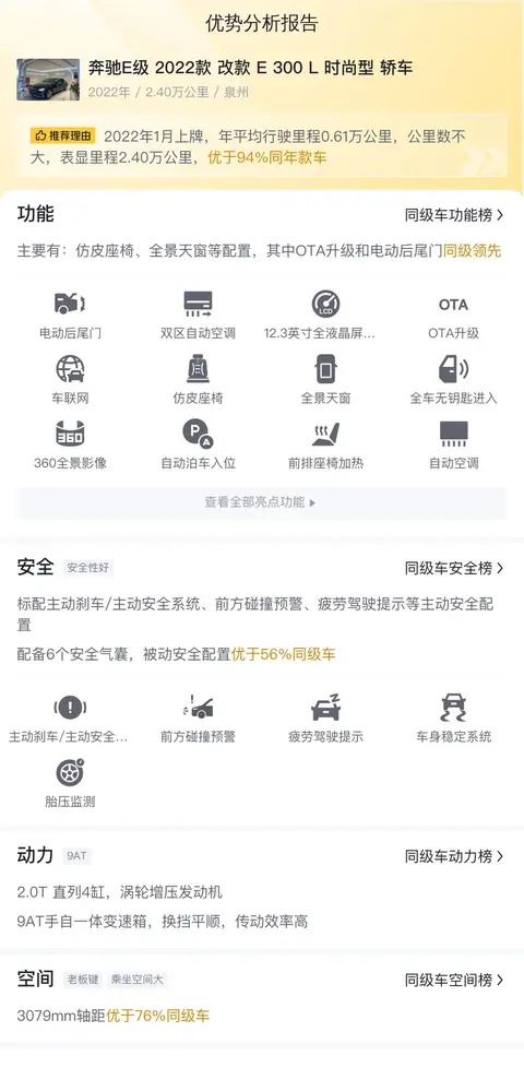 奔驰E级 最低售价:32.18万起 最高降价:13.00万 图片 参数配置 询底价 懂车分4.11 懂车实测空间·性能等 车友圈46万 车友热议 二手车1.38万起 | 4459 辆先介绍一下这辆车的基本信息,该车具体版本是——奔驰E级 2022款 改款 E 300 L 时尚型 轿车,上牌地为福建泉州,上牌日期2022年1月,表显里程2.4万公里,新车指导价47.57万,二手车报价32.38万,过户次数2次。