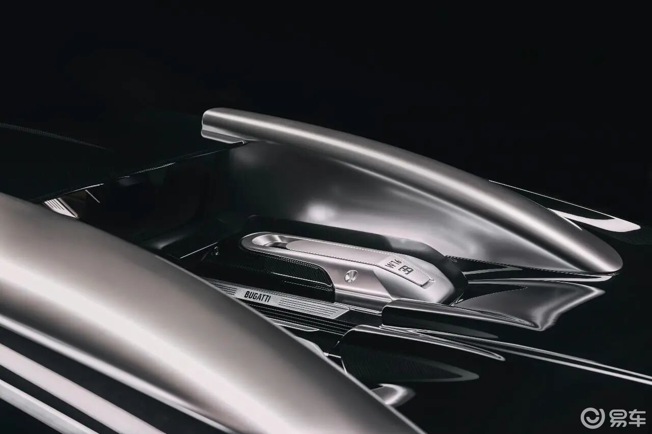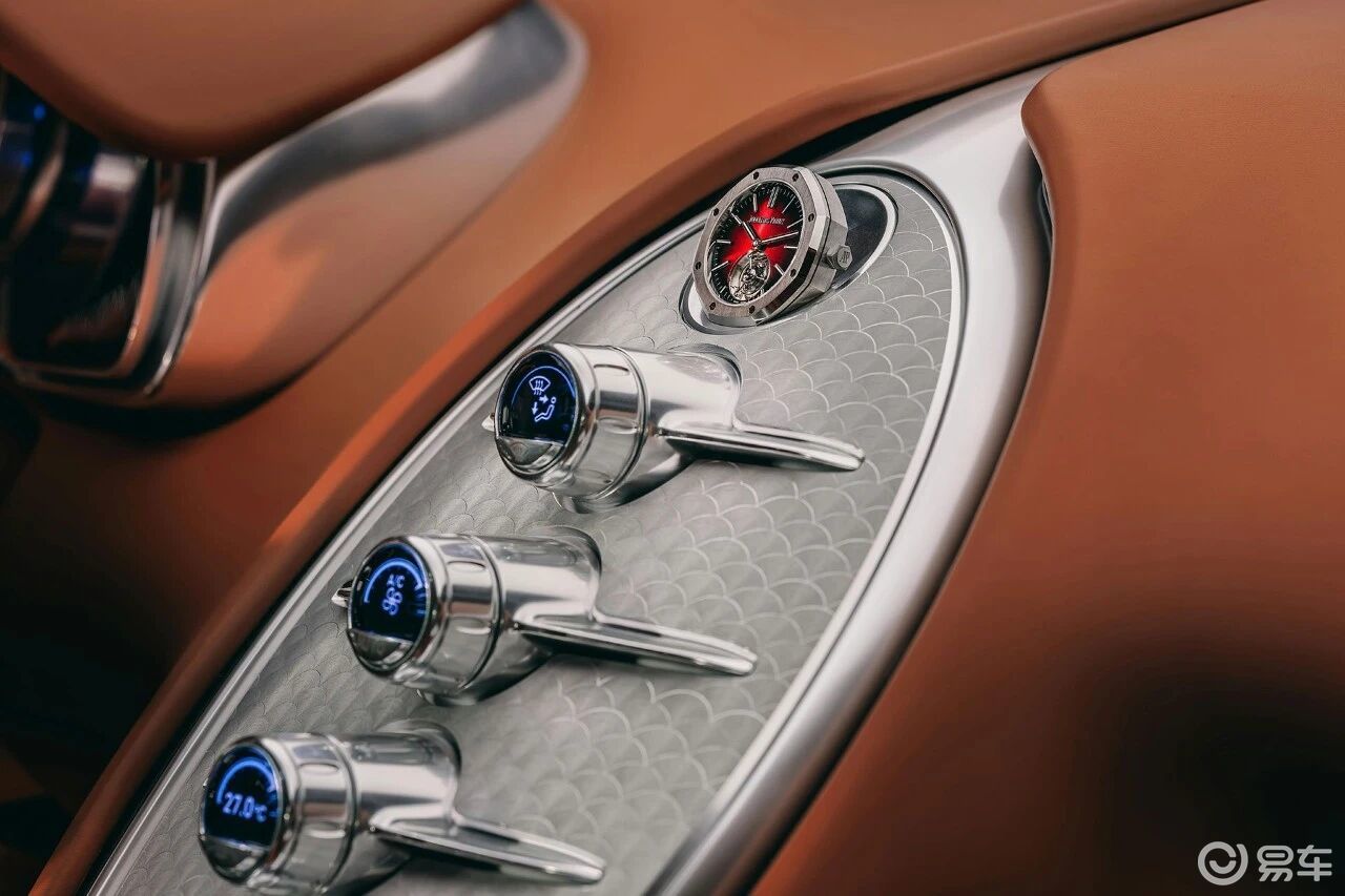 最亮眼的是中控顶端,嵌入一枚41毫米爱彼皇家橡树陀飞轮腕表,八角形表身复刻皇家橡树号战列舰炮塔设计,自动上链机芯精准可靠,搭配玑镂工艺装饰的专属底座——这一工艺源自埃托雷·布加迪曾打造的直列八缸发动机缸盖,让品牌传承与奢华质感完美融合。车内还随处可见碳纤维饰板,轻量化与奢华感做到了极致平衡。
