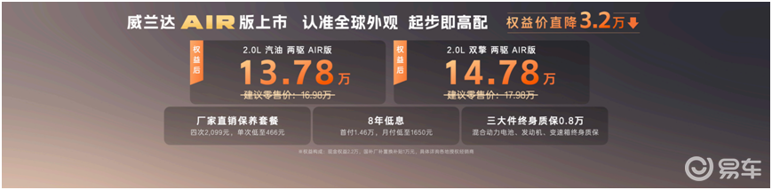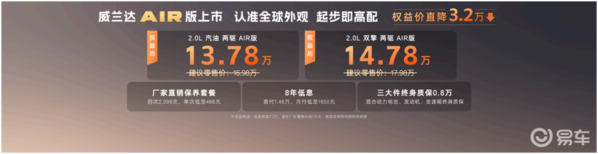 除了产品和服务的调整,威兰达AIR版在购车权益上也做了叠加。官方提供“开年三重礼”:下订即享2.2万元现金优惠,叠加国补和厂补合计1万元,综合权益后直降3.2万元。最终,2.0L汽油AIR版权益价13.78万元,2.0L混动AIR版权益价14.78万元。