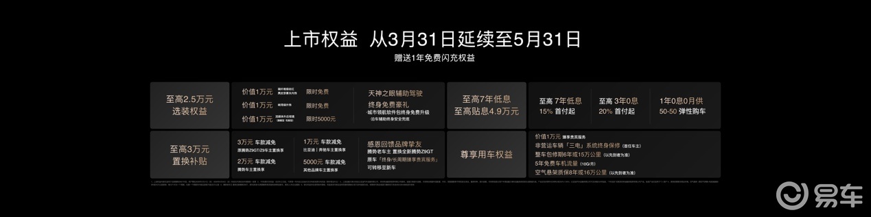 而且今天也不只是品鉴那么简单啊,腾势汽车总经理李慧在现场也是把诚意给大家拉满了,一堆购车权益比如1年免费闪充、至高4.9万贴息等直接延期到了5月31日!